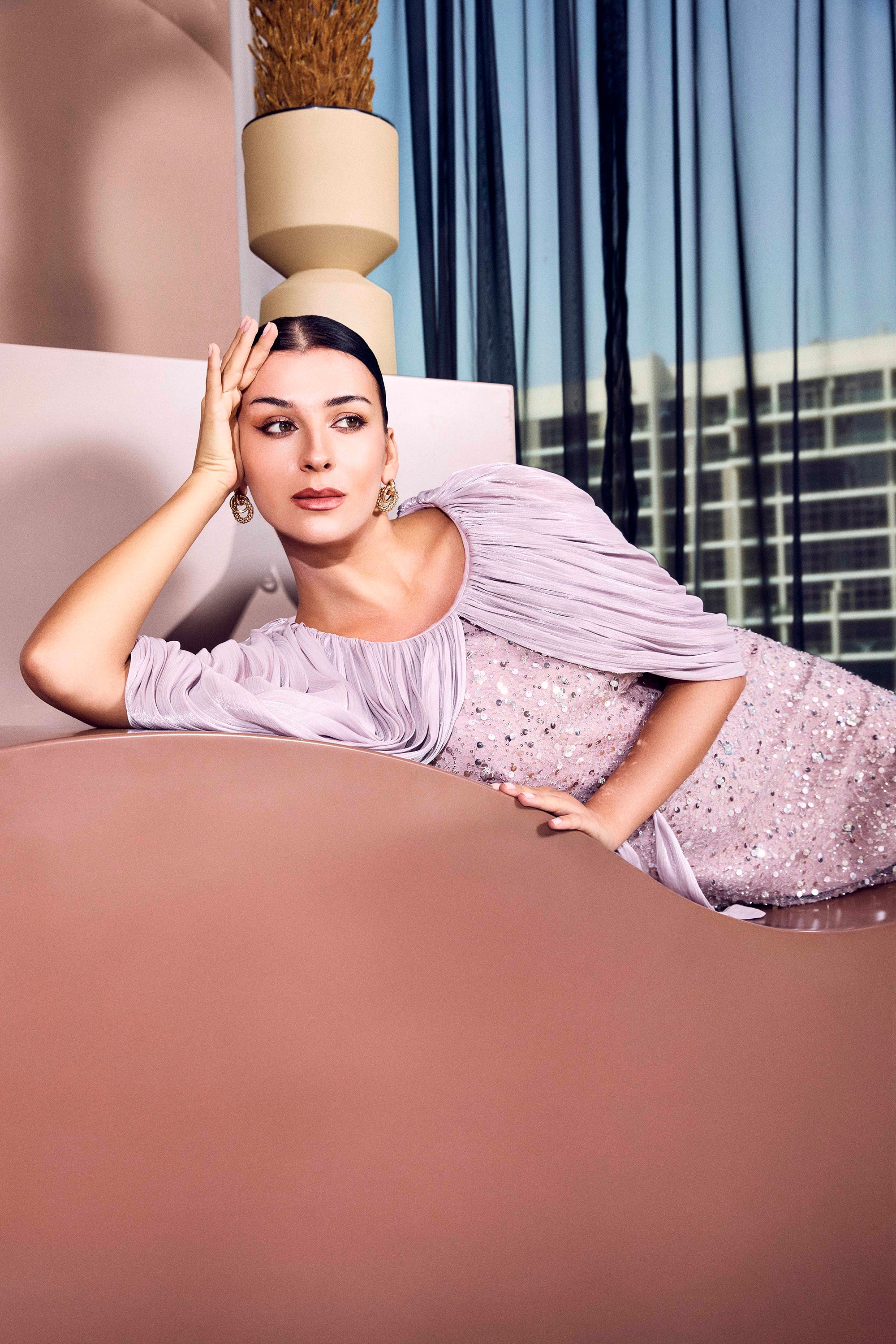 Sequin Embellished Gown with Organza Drape